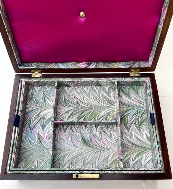 Lined with vibrant pink satin and complementary printed marbled paper