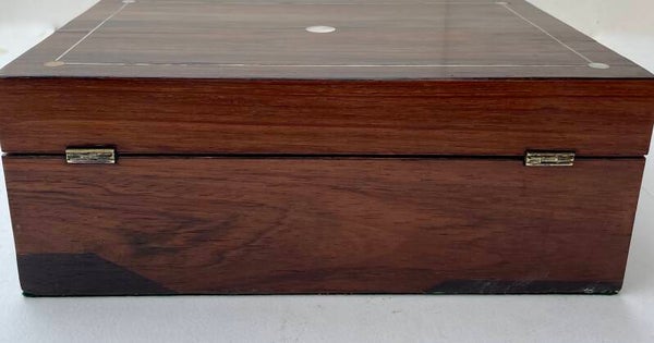 Rosewood Jewellery or Keepsake Box. In the Pink! A good size box with Pewter Stringing and Mother of Pearl Roundels (Circa 1890-1910)