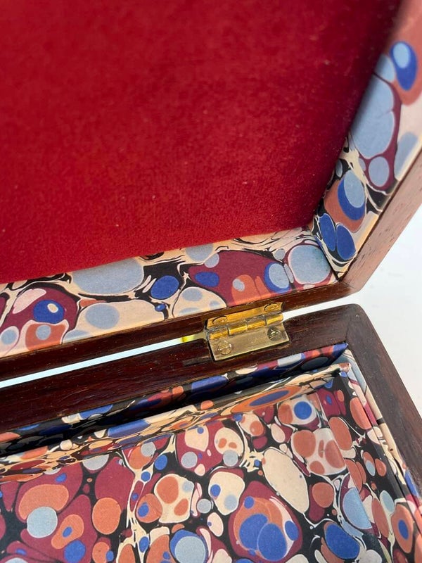 Lined with vibrant fine red velvet and complementary printed marbled paper