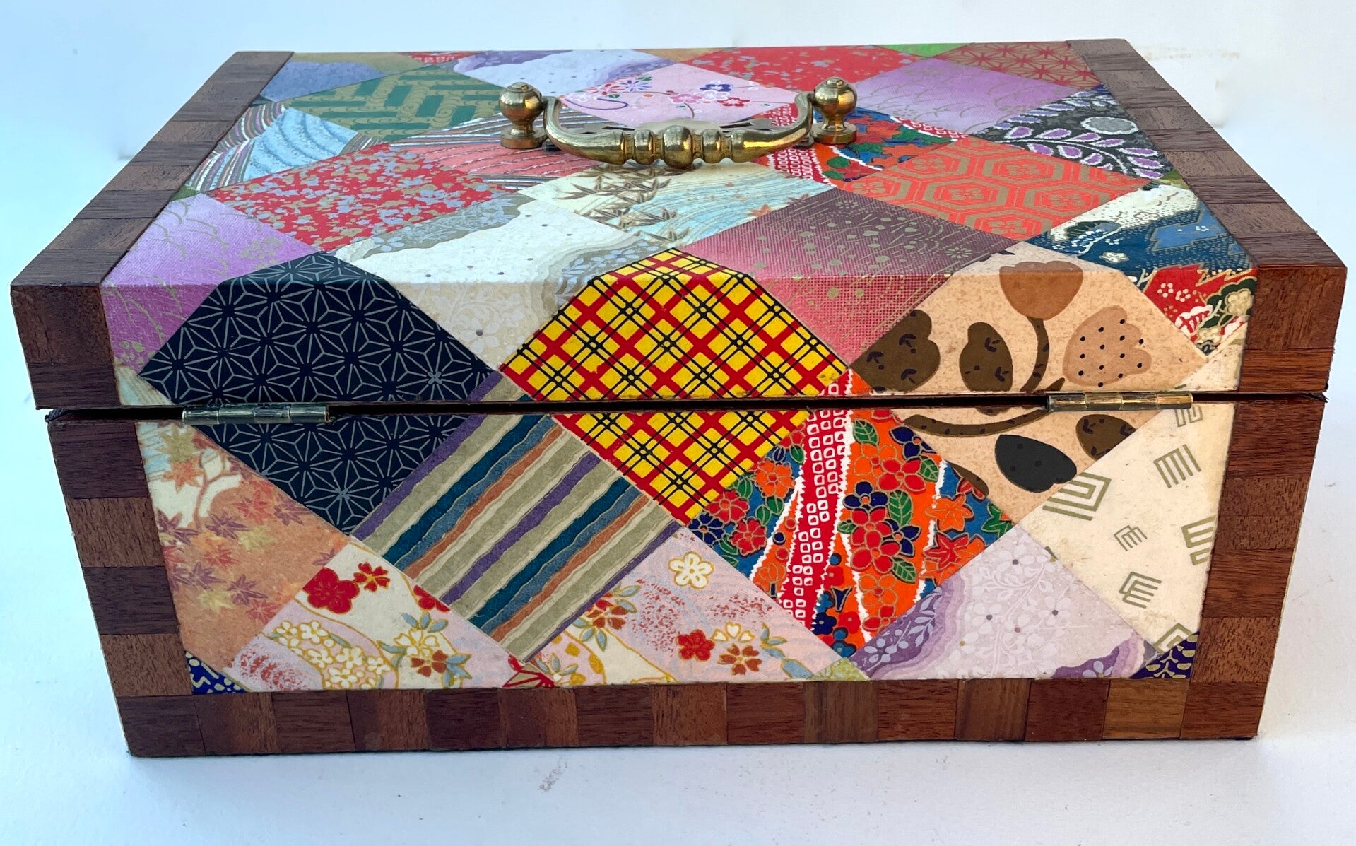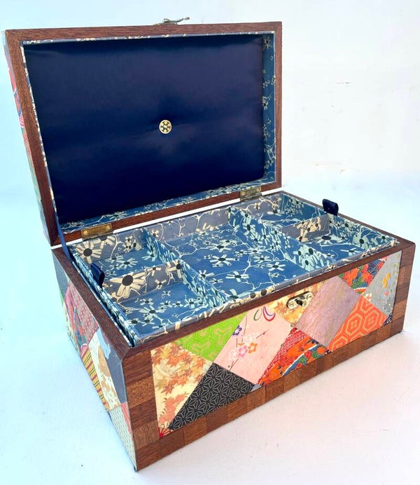 A totally unique box covered with symmetrical squares of brightly coloured papers, these hand crafted papers were from a collection of papers brought back from Japan many years ago