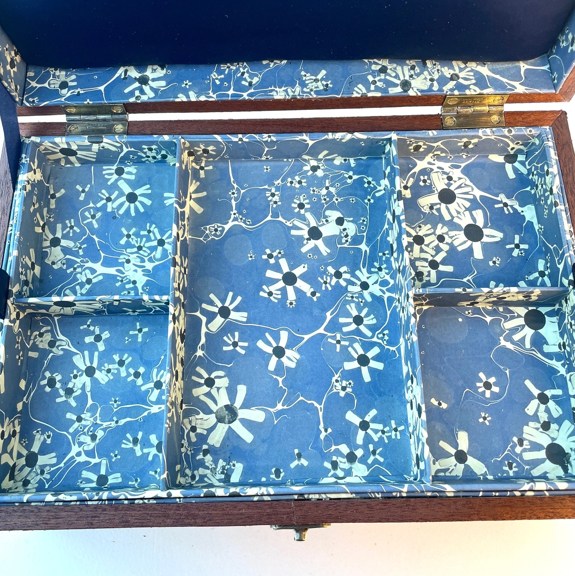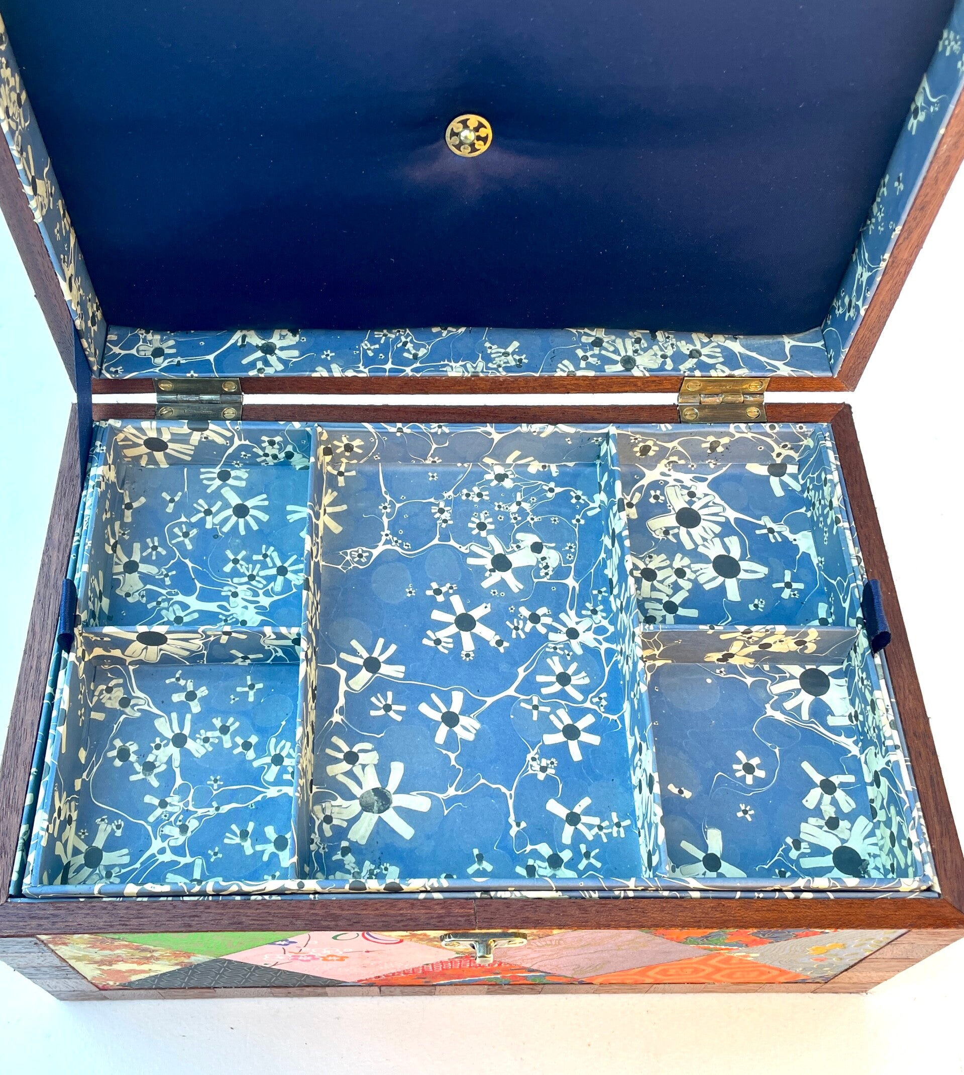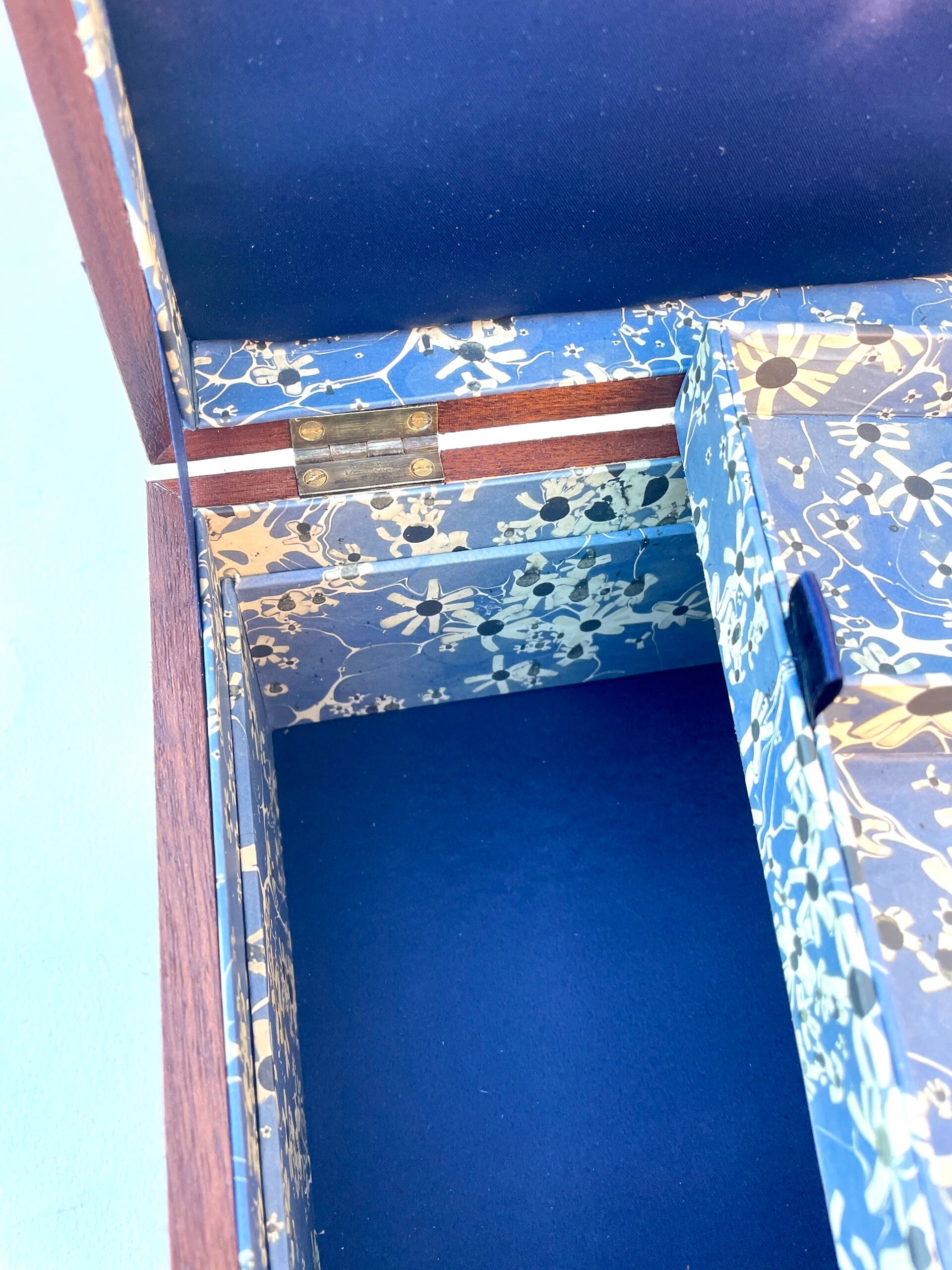 Lined with dark blue satin and printed marbled paper that has a Japanese feel to it